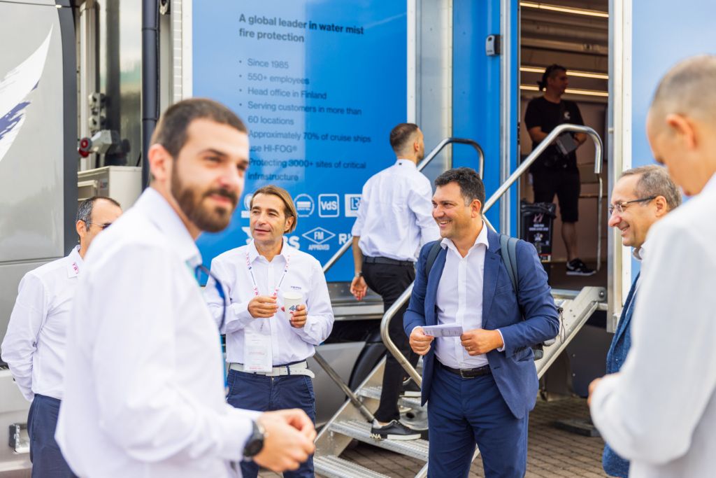 Parked right at the entrance of the exhibition, the Marioff truck welcomed hundreds of visitors who stepped inside to experience live demonstrations and learn more about HI-FOG® water mist fire suppression technology. The brilliant weather and central location created the perfect stage for meaningful conversations about fire safety and Marioff’s role in advancing protection at sea and on land.